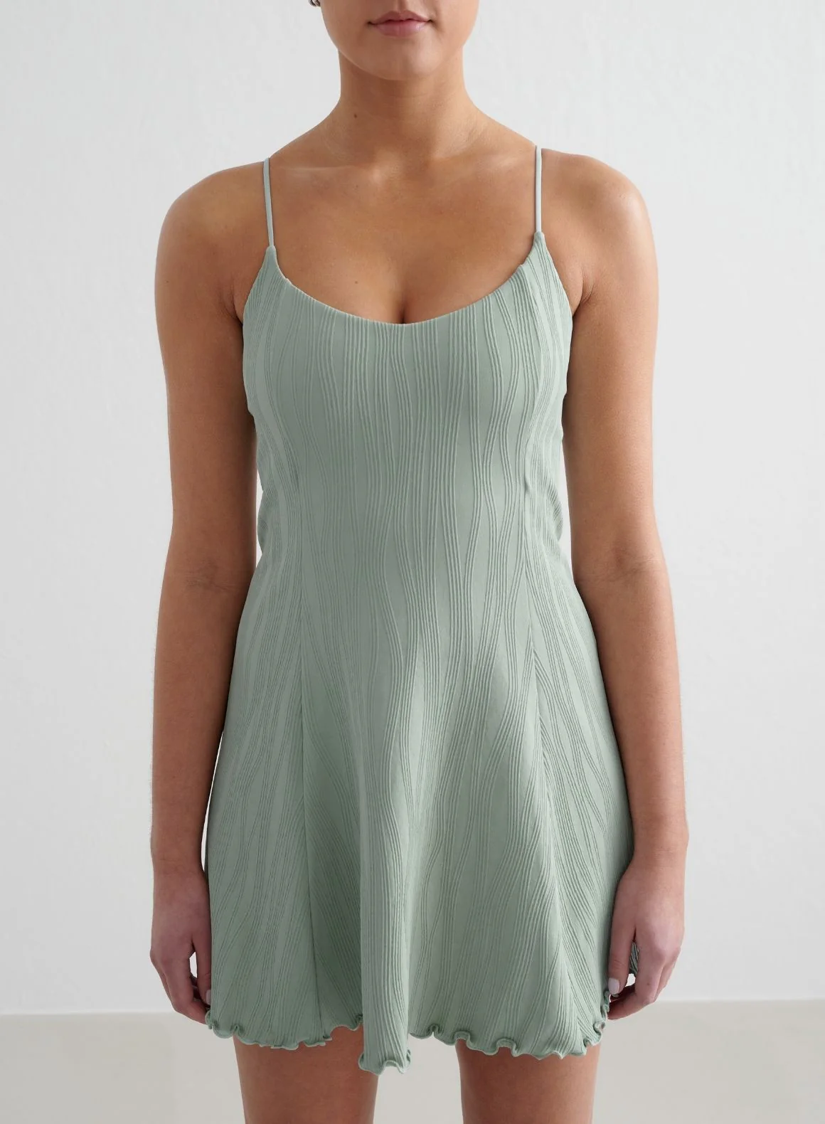 Aqua Tulip Dress is a stretchy dress made from a functional, moisture-wicking material with a wavy structure. The dress has thin straps and features a metal logo badge at back. The dress has frilled edges.