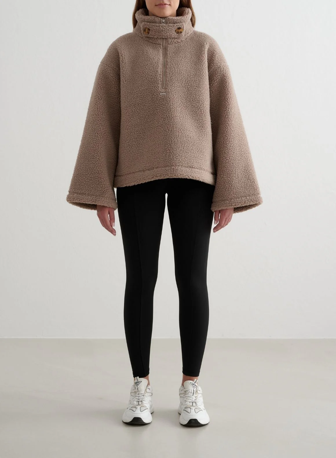 Dark Clay Pile Anorak is a teddy jacket in an anorak style, made from soft and warming pile. The sherpa jacket has a boxy, relaxed fit and a high collar with buttons. The button closure at the collar is detachable. The teddy jacket eatures wide sleeves and two spacious zippered pockets with a brushed lining for extra warmth. The pile jacket also has a half-zip closure and a metal tag with the aim’n logo on the front.