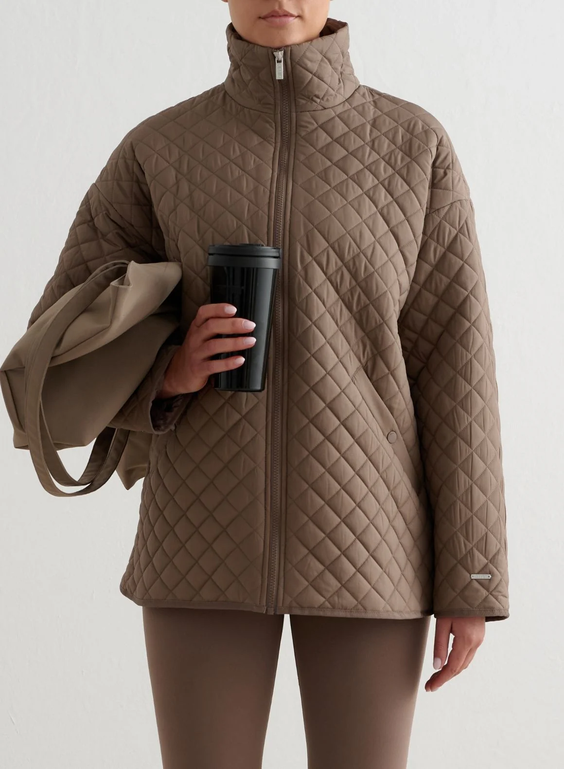 Classic meets modern in Nougat Oversized Quilted Jacket. Designed from recycled fabric with a water-repellent (Bionic-Finish® ECO) surface, this classic jacket offers both style and function. Oversized Quilted Jacket features a stand collar, full zip at front, and practical buttoned pockets. The quilted jacket features push buttons at cuffs. With an oversized fit and metal aim’n logo details, this is the ideal jacket for all occasions.